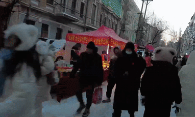 2024年1月22日,在哈尔滨红专街早市,游客穿着厚厚羽绒服逛街。