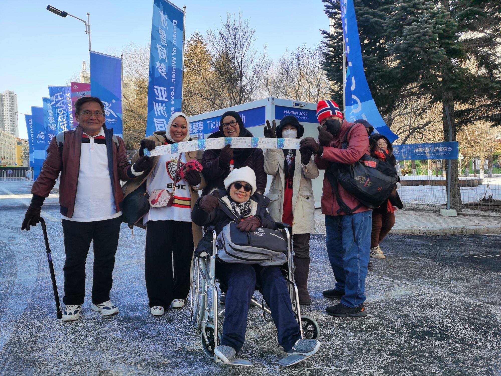 △阿伊莎(后排左二)一家六口在亚冬会赛场外合影