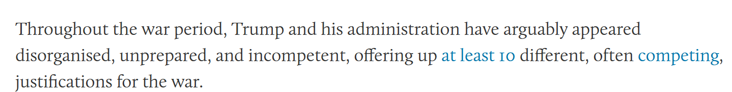 文章认为,美国政府追随以色列的决定实际上分裂了MAGA(“让美国再次伟大”运动)的基本盘。不少知名MAGA人物公开谴责美国政府的开战决定,这可能危及共和党的中期选举。此外,整个战争期间,美国政府表现得杂乱无章、准备不足且缺乏能力,至少提出了10种不同的且常常相互矛盾的开战理由,引发众怒。