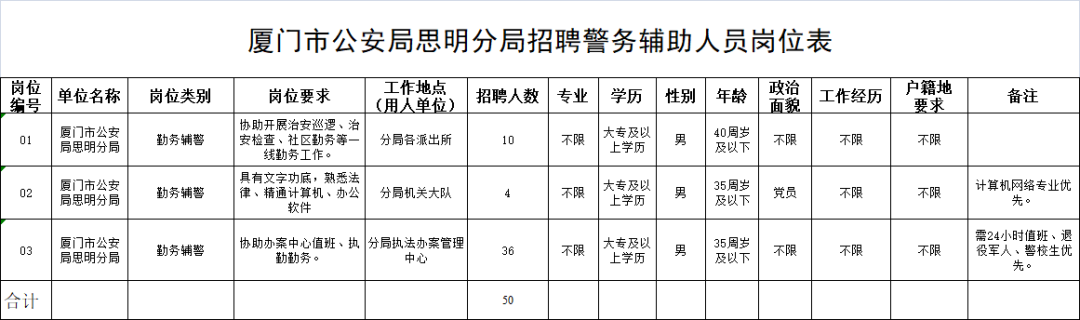 因工作需要 厦门市公安局思明分局、湖里分局 现面向社会公开招聘 133名警务辅助人员 1名后勤人员 划重点!快来get↓↓ 厦门市公安局思明分局招聘 警务辅助人员50名 一、招聘岗位及条件 1、招聘岗位: