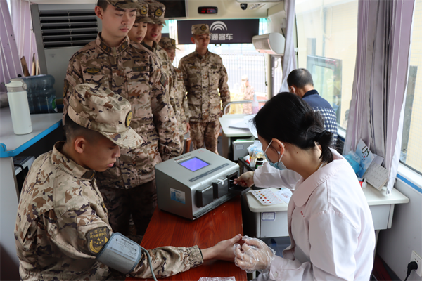 志愿者引导献血者填写登记表 戎装虽解,军魂不改。在志愿者的引导下,大家有序进行信息登记、血压测量、抽血化验。随后,医务人员认真解说无偿献血健康知识、注意事项后,这些“最可爱的人”纷纷挽起袖子献出“热血”。在人群中,既有第一次参加献血英勇无畏的“新兵”,也有连续多年献血的“老兵”,据统计,两天他们共献出28400毫升热血,有效缓解了当地用血紧张的局面。