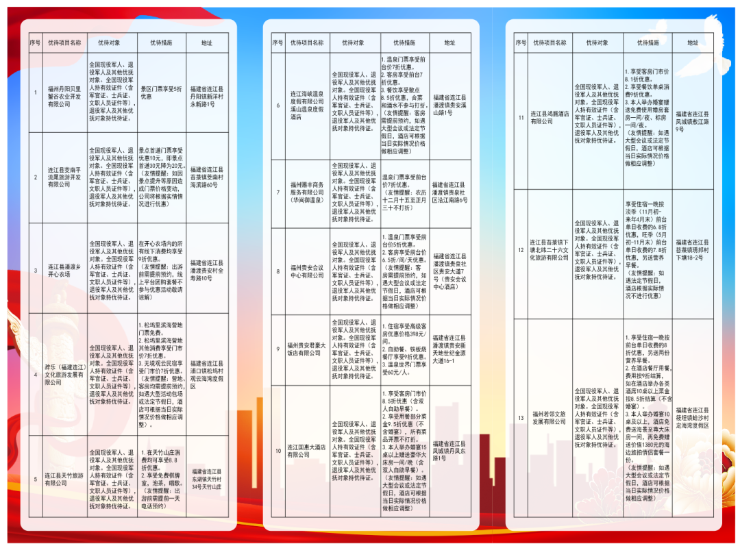 “拥军大联盟”单位优待项目(部分) 根据协议内容,“拥军大联盟”各成员单位将立足自身行业特点和资源优势,聚焦现役军人、退役军人及家属的实际需求,在文旅、教育、医疗、餐饮等多个民生领域精准提供 “三优服务”(优质产品、优先待遇、优惠价格),以实打实的优惠来增强军人军属、退役军人的荣誉感、获得感与幸福感。自2024年5月连江“拥军大联盟”成立以来,社会各界响应热烈,截至目前,已有24家企业踊跃加入,联盟的社会影响力与服务覆盖面持续扩大。 “我们深耕家庭教育领域多年,始终心怀对军人的敬意,希望通过专业服务为军人家庭提供更有力的教育支持。”连江行知教育咨询服务部主理人邵文慧表示 “我十分崇拜军人,所以这次能加入‘拥军大联盟’既喜悦又荣幸。”连江兴达汽车培训有限公司董事长李章财表示,他们计划为全国现役军人、退役军人及其他优抚对象提供驾校培训8.5折的专属优惠。 为现役军人家庭送去立功喜报