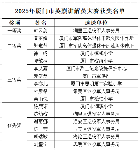 经过激烈角逐,大赛最终评选出一等奖1名、二等奖3名、三等奖6名及优秀奖6名,来自湖里区的退役军人参赛选手韩云剑凭借扎实讲解功底荣获一等奖。