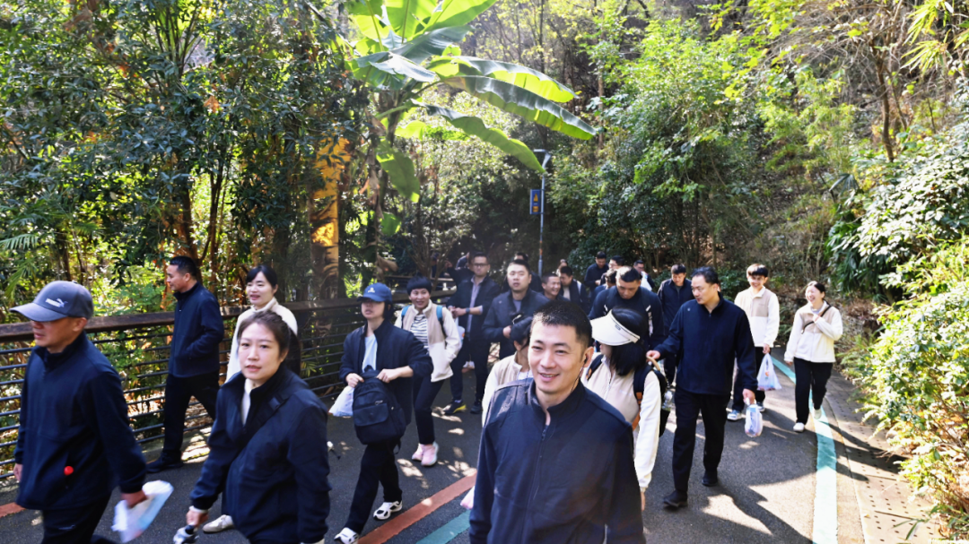 当天10时15分,健步走活动正式开始。全体人员一路沿着蜿蜒的登山步道稳步前行,一路上,大家精神饱满,脸上洋溢着自信的笑容。有的同志步伐轻快,一路领先,展现出勇争第一的决心;有的同志则相互鼓励,携手共进,展现了积极向上的精神风貌。途经茉莉园、祈福台、不见桥等景观节点,大家纷纷驻足欣赏,感受着大自然的美丽与宁静。最终,全体人员顺利抵达芙蓉园终点。