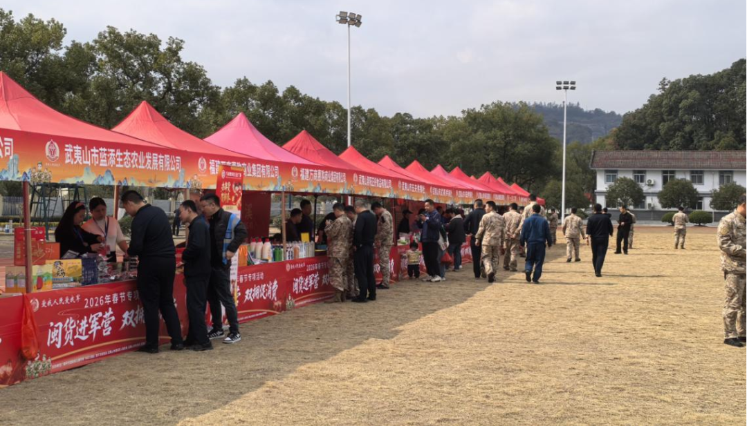 2月6日至8日,由南平市退役军人事务局、南平市商务局,武夷山市退役军人事务局、武夷山市商务局、武夷山市供销合作社联合社共同主办的2026年“闽货进军营 双拥促消费”春节专项活动在南平驻军某部军营热烈开展。一场别开生面的“军营新春大集”,让闽北优质特产走进军营,以消费助企的创新形式,为官兵们送上满满的新春祝福与地方温情。